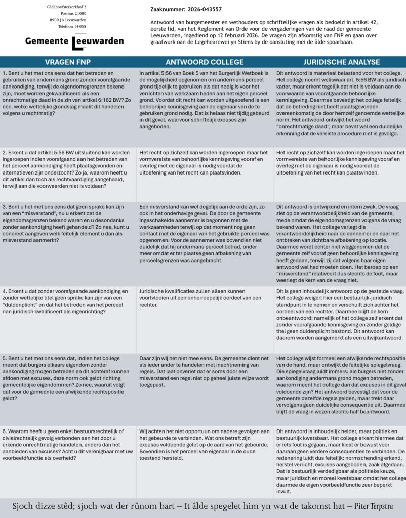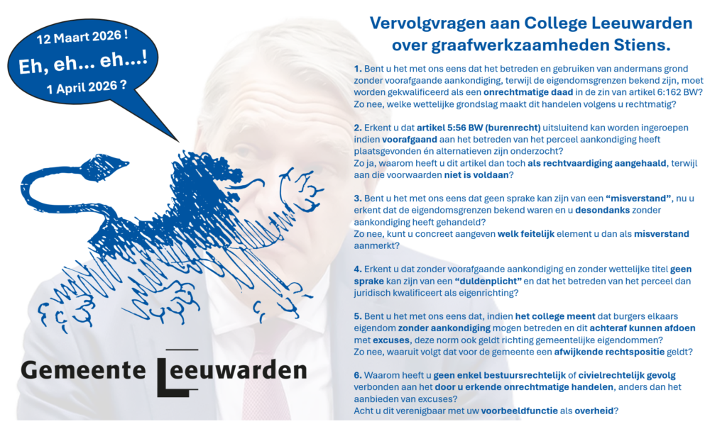In aanloop naar de gemeenteraadsverkiezingen van maart 2026 ligt hier een duidelijke vraag voor de gemeenteraad van Leeuwarden. Niet als politieke tegenstelling, maar als toets van bestuurlijke verantwoordelijkheid. Uw raad draagt daarmee ook de eindverantwoordelijkheid voor de wijze waarop het college handelt, hoe ambtenaren opereren en hoe wordt omgegaan met burgers, eigendom en rechtstatelijke beginselen.